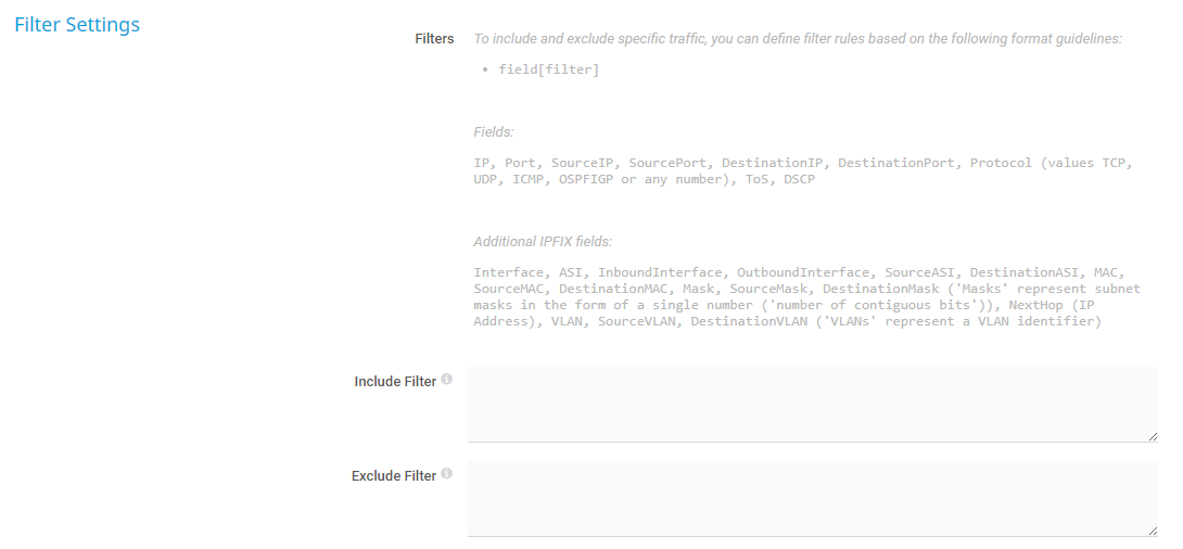Define if you want to filter any traffic. If you leave this field empty, the sensor includes all traffic. To include specific traffic only, define filters using a special syntax.